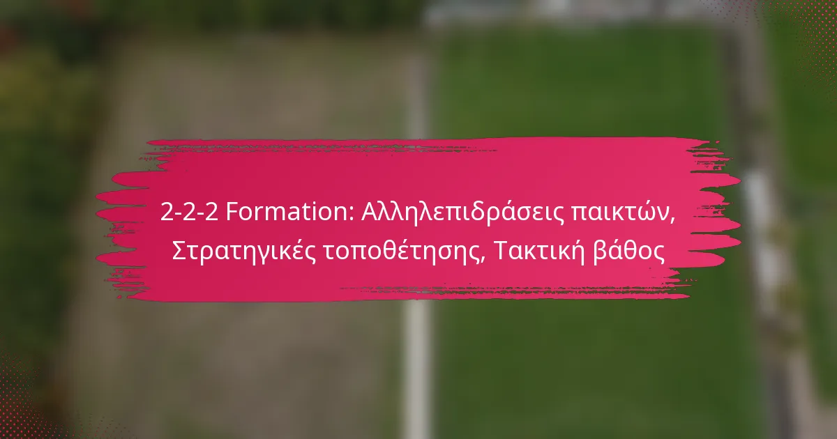 Η διάταξη 2-2-2 στο ποδόσφαιρο είναι μια τακτική ρύθμιση που περιλαμβάνει δύο αμυντικούς, δύο μέσους και δύο επιθετικούς, επιτυγχάνοντας μια ισορροπία μεταξύ άμυνας και επίθεσης. Αυτή η διάταξη βασίζεται σε μεγάλο βαθμό στις αλληλεπιδράσεις και την επικοινωνία των παικτών, επιτρέποντας ρευστές μεταβάσεις και στρατηγική τοποθέτηση στον αγωνιστικό χώρο. Με την βελτιστοποίηση της χωρικής αντίληψης και την αξιοποίηση των ρόλων των παικτών, οι ομάδες μπορούν να προσαρμόσουν αποτελεσματικά τις τακτικές τους για να αντεπεξέλθουν στους αντιπάλους, διατηρώντας παράλληλα μια συνεκτική δομή.